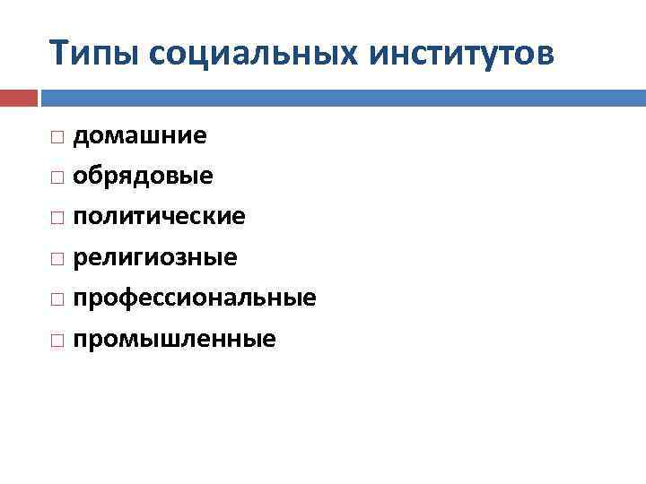 Типы социальных институтов домашние обрядовые политические религиозные профессиональные промышленные