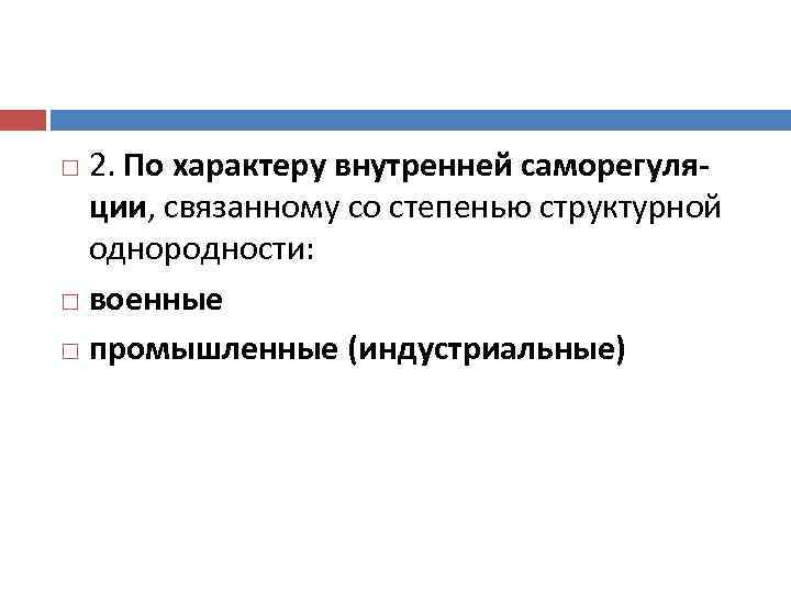 2. По характеру внутренней саморегуляции, связанному со степенью структурной однородности: военные промышленные (индустриальные)