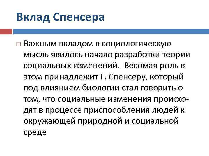 Вклад Спенсера Важным вкладом в социологическую мысль явилось начало разработки теории социальных изменений. Весомая роль в этом принадлежит Г. Спенсеру, который под влиянием биологии стал говорить о том, что социальные изменения происходят в процессе приспособления людей к окружающей природной и социальной среде