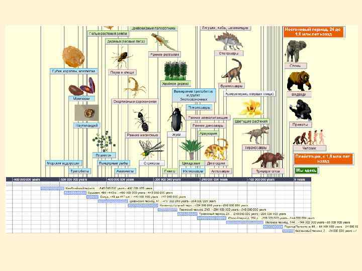 Основные ароморфозы: Ядро, митоз, половой процесс (мейоз, диплоидность), многоклеточное строение, ткани и органы, оогамия и внутреннее оплодотворение У животных – билатеральность, развитие из трехслойного зародыша, кровеносная система, дыхательная система, скелет наружный и затем внутренний, пятипалые конечности рычажного типа, зародышевые оболочки, несмешанное кровообращение, гомойотермия У растений – семенное размножение, цветок, мутуализм с опылителями, двойное оплодотворение, плод Обилие древовидных папоротникообразных в каменноугольном периоде и гигантская стрекоза МЕГАНЕВРА – иллюстрация того, как организмы меняют среду обитания (40% О 2) и адаптируются к ней – дыхание с помощью трахейной системы только благодаря высокому содержанию кислорода может позволить насекомым стать крупными