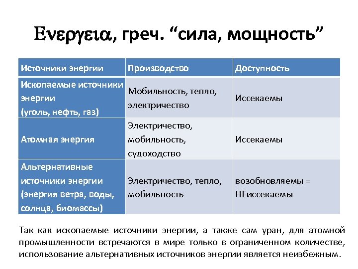 , греч. “сила, мощность” Источники энергии Производство Ископаемые источники Мобильность, тепло, энергии электричество (уголь, нефть, газ) Электричество, Атомная энергия мобильность, судоходство Альтернативные источники энергии Электричество, тепло, (энергия ветра, воды, мобильность солнца, биомассы) Доступность Иссекаемы возобновляемы = НЕиссекаемы Так как ископаемые источники энергии, а также сам уран, для атомной промышленности встречаются в мире только в ограниченном количестве, использование альтернативных источников энергии является неизбежным.