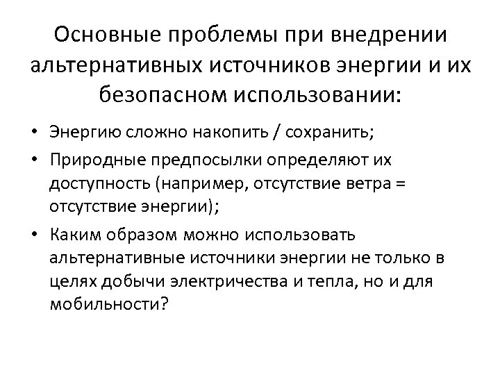 Основные проблемы при внедрении альтернативных источников энергии и их безопасном использовании: • Энергию сложно накопить / сохранить; • Природные предпосылки определяют их доступность (например, отсутствие ветра = отсутствие энергии); • Каким образом можно использовать альтернативные источники энергии не только в целях добычи электричества и тепла, но и для мобильности?
