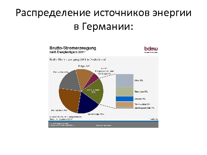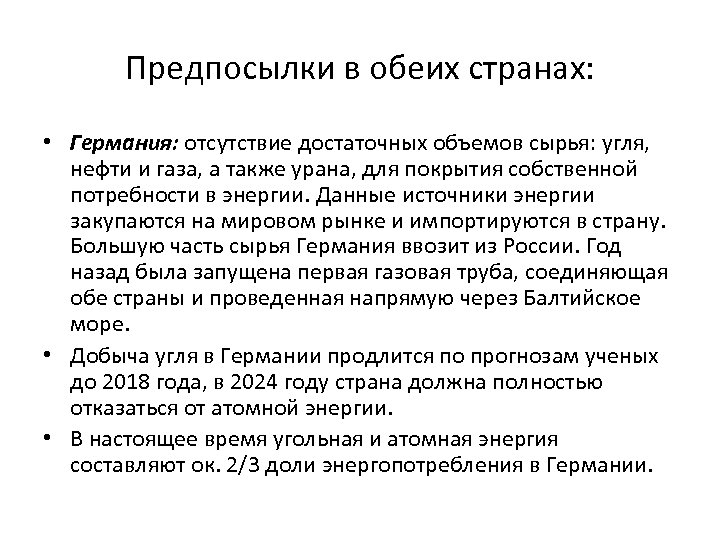 Предпосылки в обеих странах: • Германия: отсутствие достаточных объемов сырья: угля, нефти и газа, а также урана, для покрытия собственной потребности в энергии. Данные источники энергии закупаются на мировом рынке и импортируются в страну. Большую часть сырья Германия ввозит из России. Год назад была запущена первая газовая труба, соединяющая обе страны и проведенная напрямую через Балтийское море. • Добыча угля в Германии продлится по прогнозам ученых до 2018 года, в 2024 году страна должна полностью отказаться от атомной энергии. • В настоящее время угольная и атомная энергия составляют ок. 2/3 доли энергопотребления в Германии.