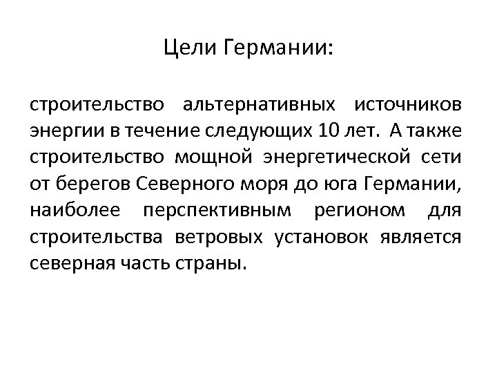Цели Германии: строительство альтернативных источников энергии в течение следующих 10 лет. А также строительство мощной энергетической сети от берегов Северного моря до юга Германии, наиболее перспективным регионом для строительства ветровых установок является северная часть страны.