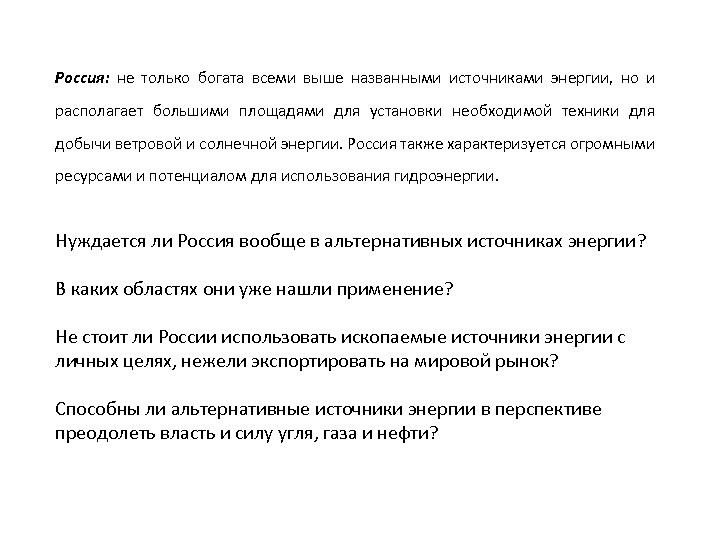 Россия: не только богата всеми выше названными источниками энергии, но и располагает большими площадями для установки необходимой техники для добычи ветровой и солнечной энергии. Россия также характеризуется огромными ресурсами и потенциалом для использования гидроэнергии. Нуждается ли Россия вообще в альтернативных источниках энергии? В каких областях они уже нашли применение? Не стоит ли России использовать ископаемые источники энергии с личных целях, нежели экспортировать на мировой рынок? Способны ли альтернативные источники энергии в перспективе преодолеть власть и силу угля, газа и нефти?