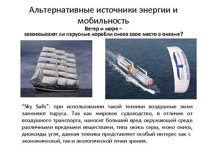 Альтернативные источники энергии и мобильность Ветер и море – завоевывают ли парусные корабли снова свое место в океане? “Sky Sails”: при использовании такой техники воздушные змеи заменяют паруса. Так как мировое судоходство, в отличие от воздушного транспорта, наносит больший вред окружающей среде различными вредными веществами, типа окись серы, моно окись, диоксиды угля, данная техника представляет особый интерес как с экономической, так и экологической точки зрения.