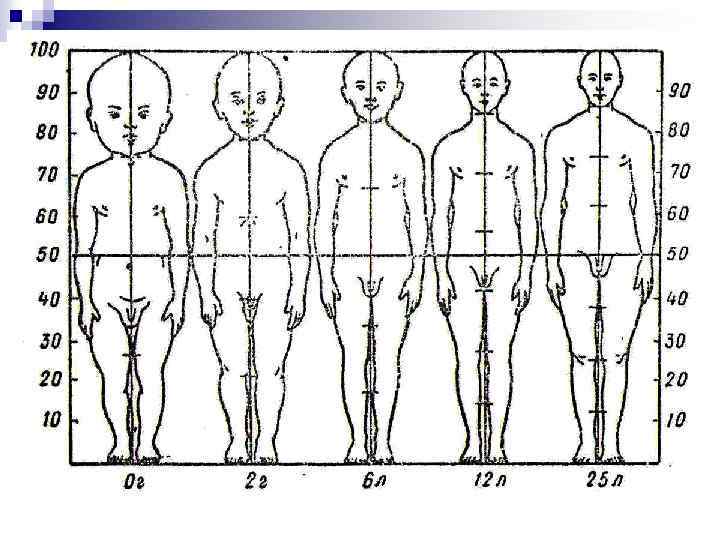 Возраст Соотношение голова: туловище Грудной 1: 4 1 округление, 2 -4 г. 1: 5 1 вытягивание, 5 – 7 лет 1: 6 2 округление, 9 -10 лет 1: 6, 5 2 вытягивание, 11 -15 лет 1: 7 Созревание, 16 -20 лет 1: 8 Зрелый возраст, 20 -24 г. 1: 8