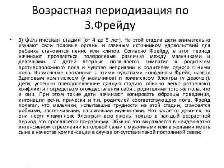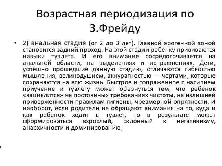 3. Локомоторно-генитальная. Стадия инфантильной генитальности • На этой стадии происходит самое важное по последствиям разделение между потенциальным триумфом человека и потенциальным тотальным разрушением. Именно здесь ребенок навсегда становится разделившимся внутри себя: на детский набор, сохраняющий изобилие потенциалов роста, и родительский набор, поддерживающий и усиливающий самоконтроль, самоуправление и самонаказание. Развивается чувство моральной ответственности