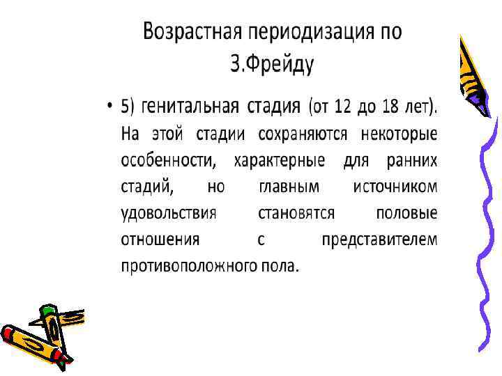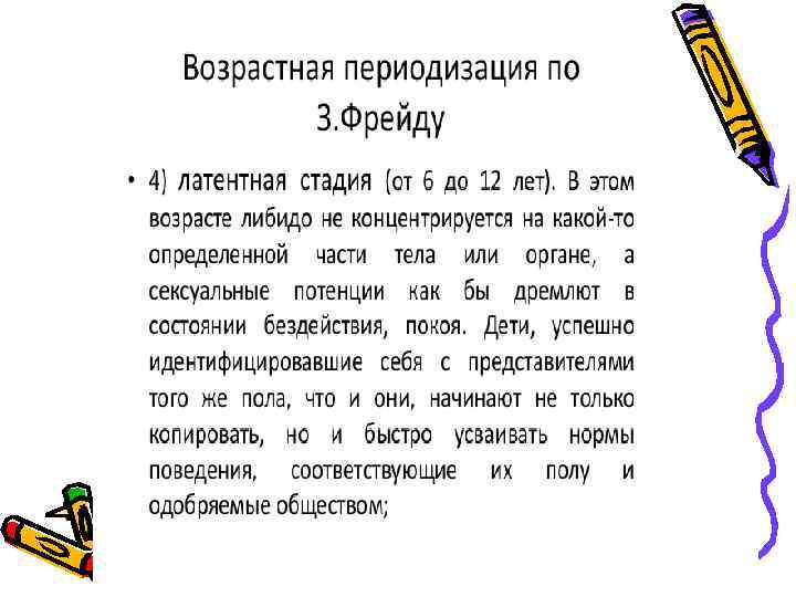 4. Латентная. • Соответствует латентной фазе классического психоанализа. Возраст – 6— 11 лет. Задача этапа: трудолюбие (умелость) против чувства неполноценности. Ценные качества, приобретаемые на этом этапе: систематичность и компетентность. • Любовь и ревность находятся на этой стадии в скрытом состоянии, о чем и говорит ее название – латентная. Ребенок проявляет способность к дедукции, организованным играм, регламентированным занятиям. Интерес к тому, как устроены вещи, как их приспособить, освоить. В эти годы он напоминает Робинзона Крузо и часто интересуется его жизнью.