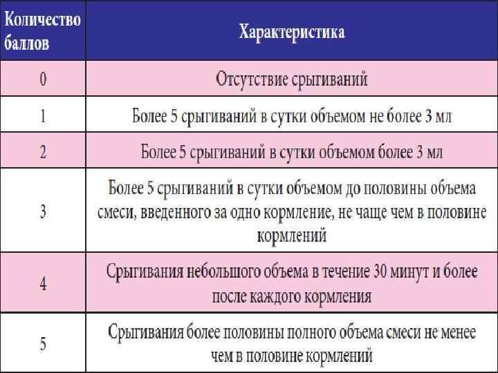 n n Клиника Обычно при физиологических срыгиваниях состояние ребенка не страдает, прибавка в весе соответствует возрастным показателям, аппетит хороший. Срыгивания появляются внезапно, без каких-либо предвестников и происходят без заметного участия мышц живота и диафрагмы. Они также возникают во время или после кормления и не доставляют ребенку беспокойства. Объем срыгиваемых масс небольшой, имеет запах молока (смеси) или немного кисловатый.