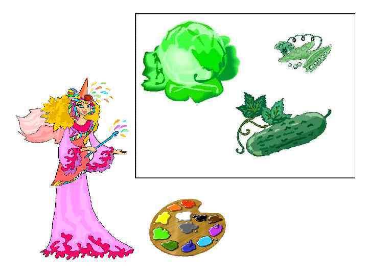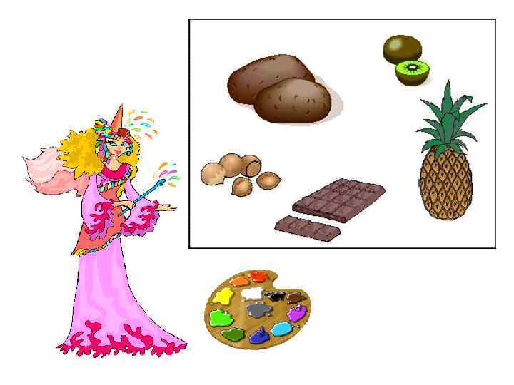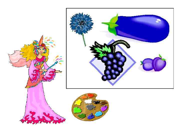 Внезапно появилась фея Разноцветье! У меня есть волшебная палитра. Помогите мне поскорее раскрасить сказочный мир! Верните предметам их цвета!