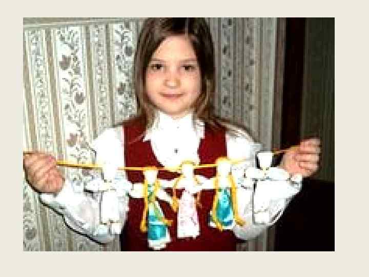 Куколка «Веснянка» В старину славянские девушки по весне делали яркие куклы и дарили их другу. Волосы (космы) у традиционных куколок «Веснянок» всегда были из ярких ниток. Кукла давалась на радость, на будущие надежды, на здоровье. Ранней весной она должна была яркими красками напомнить, что скоро придет тепло и земля станет такой же красочной, как она сама. Веснянку берегли до следующей весны, а потом мастерили новую. Кукла хранилась как память о прошедшей весне, о теплом лете, о холодной зиме. Куклу обычно делали размером с ладошку. Хотя она и небольшая, а силы и солнца в ней припасено до следующей весны. Куколка Веснянка – это русский оберег славутности, молодости и красоты. Когда ее дарят женщине или девушке, то желают этим вечной молодости и красоты. Куколкой оделяли доброй весной. Веснянку можно подарить друзьям и близким, украсить интерьер, сделать детям для игры.