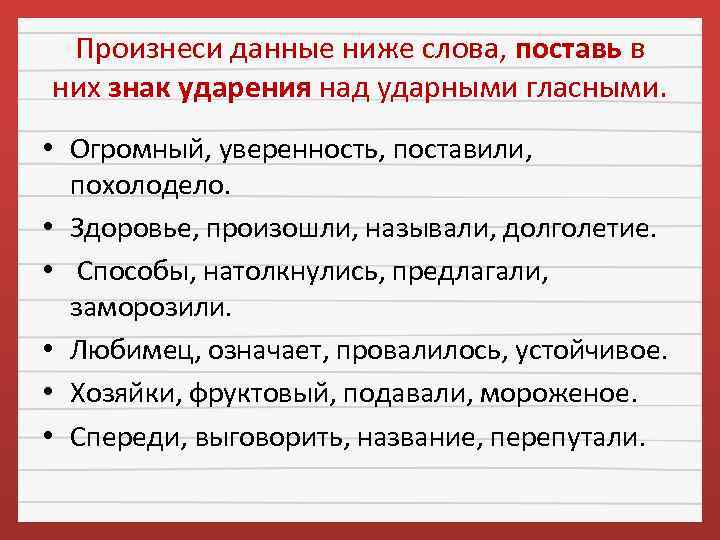 Произнеси данные ниже слова, поставь в них знак ударения над ударными гласными. • Огромный, уверенность, поставили, похолодело. • Здоровье, произошли, называли, долголетие. • Способы, натолкнулись, предлагали, заморозили. • Любимец, означает, провалилось, устойчивое. • Хозяйки, фруктовый, подавали, мороженое. • Спереди, выговорить, название, перепутали.