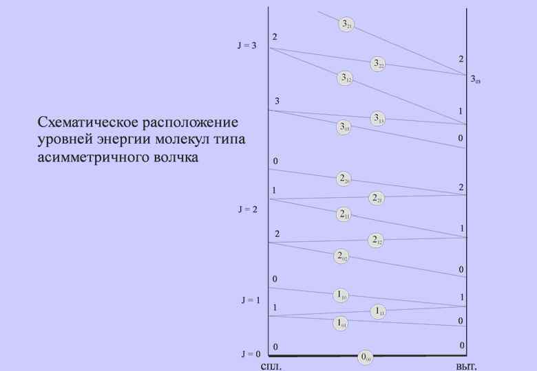 Типы волчков. II Энергия для вытянутого волчка Энергия для сплюснутого волчка правило отбора для J Правило отбора для K 4. Молекулы типа ассиметричного волчка и Параметр асимметрии: а) для вытянутого волчка б) для сплюснутого волчка Энергия вращения: – функция только параметра асимметрии Для данного J имеются 2 J+1 значение функций задаваемых числом , которое изменяется от –J до+J