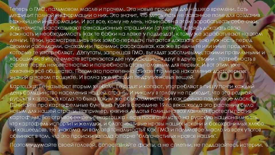 Теперь о ГМО, пальмовом масле и прочем. Это новые продукты для нашего времени. Есть дефицит полной информации о них. Это значит, что здесь есть не паханное поле для создания важнейшей информации. И вот все, кому не лень, начинают на этом зарабатывать себе очки. Журналисты рассказывают сенсационные страшилки (сплетни), пытаясь доказать свою важность и необходимость (как те бабки на лавке у подъезда), к тому же зарабатывают на этом деньги. Тётки, насмотревшись этих зомбо-передач, пытаются доказать свою нужность перед своими соседками, снохами и прочими, рассказывая, как же вредны те или иные продукты, которые те употребляют. Депутаты, запрещая ГМО, выглядят заботливыми, такими правильными и хорошими. В итоге вместе встречаются две нуждающиеся друг в друге стихии - потребность в страхе перед неизвестностью и потребность стать полезным для первых. И вот этим уже охвачено всё общество. Потом это постепенно стихает по мере накопления достоверных знаний о новом продукте. И волна уже исходит от других новых вещей. Картошка. Ее называют вторым хлебом. Ее садят и копают, употребляют в пищу почти каждый день большинство населения нашей страны. И никому в голову не приходит, что эта родная, русская картошка когда-то была таким же объектом истерии как сейчас пальмовое масло. Почитайте про картофельные бунты на Руси в середине 19 -го века, когда это растение было новым для нашей страны. Например, княгиня Авдотья Голицына возглавляла протесты против картофеля. Вот отрывок ее речи: «картошка - есть посягательство на русскую национальность, что картофель испортит и желудки, и благочестивые нравы наших искони и богохранимых хлебо - и кашеедов» . Не знакома ли вам эта тональность? Как ГМО и пальмовое масло из всех утюгов обвиняют в том, что это происки запада о порче "благочестивых нравов наших". Поэтому думайте своей головой, сопоставляйте факты, а не сплетни, не поддавайтесь истерии.