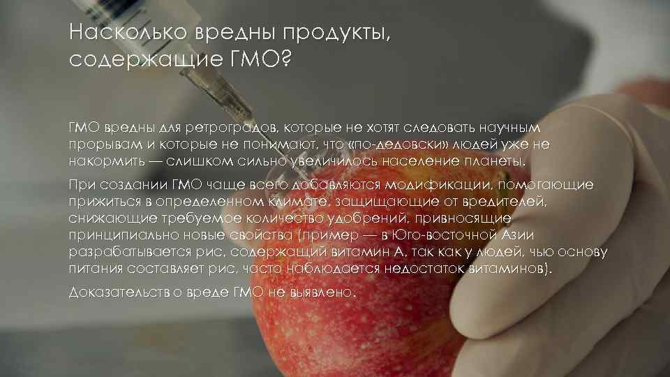 Насколько вредны продукты, содержащие ГМО? ГМО вредны для ретроградов, которые не хотят следовать научным прорывам и которые не понимают, что «по-дедовски» людей уже не накормить — слишком сильно увеличилось население планеты. При создании ГМО чаще всего добавляются модификации, помогающие прижиться в определенном климате, защищающие от вредителей, снижающие требуемое количество удобрений, привносящие принципиально новые свойства (пример — в Юго-восточной Азии разрабатывается рис, содержащий витамин А, так как у людей, чью основу питания составляет рис, часто наблюдается недостаток витаминов ). Доказательств о вреде ГМО не выявлено.