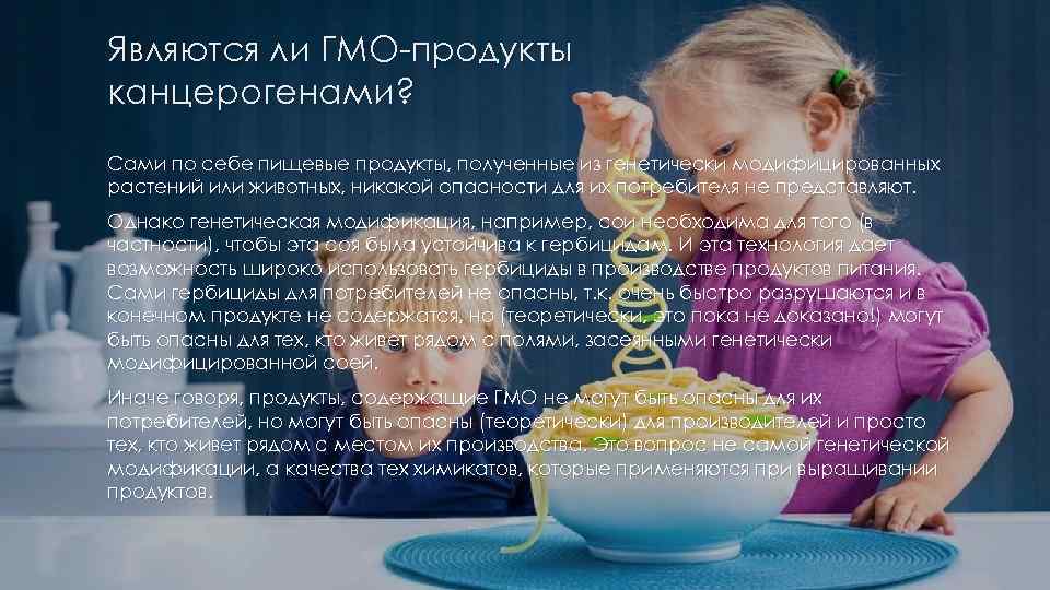 Являются ли ГМО-продукты канцерогенами? Сами по себе пищевые продукты, полученные из генетически модифицированных растений или животных, никакой опасности для их потребителя не представляют. Однако генетическая модификация, например, сои необходима для того (в частности), чтобы эта соя была устойчива к гербицидам. И эта технология дает возможность широко использовать гербициды в производстве продуктов питания. Сами гербициды для потребителей не опасны, т. к. очень быстро разрушаются и в конечном продукте не содержатся, но (теоретически, это пока не доказано!) могут быть опасны для тех, кто живет рядом с полями, засеянными генетически модифицированной соей. Иначе говоря, продукты, содержащие ГМО не могут быть опасны для их потребителей, но могут быть опасны (теоретически) для производителей и просто тех, кто живет рядом с местом их производства. Это вопрос не самой генетической модификации, а качества тех химикатов, которые применяются при выращивании продуктов.
