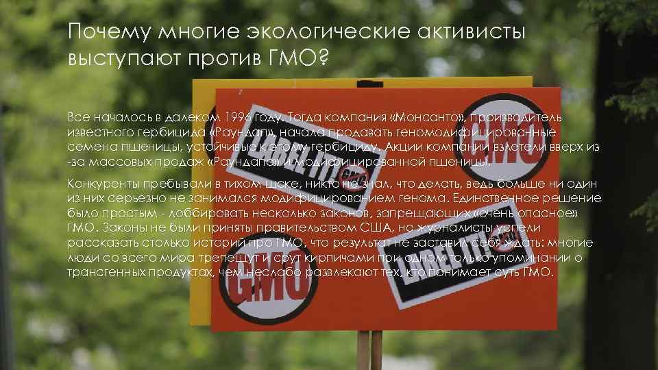 Почему многие экологические активисты выступают против ГМО? Все началось в далеком 1996 году. Тогда компания «Монсанто» , производитель известного гербицида «Раундап» , начала продавать геномодифицированные семена пшеницы, устойчивые к этому гербициду. Акции компании взлетели вверх из -за массовых продаж «Раундапа» и модифицированной пшеницы. Конкуренты пребывали в тихом шоке, никто не знал, что делать, ведь больше ни один из них серьезно не занимался модифицированием генома. Единственное решение было простым - лоббировать несколько законов, запрещающих «очень опасное» ГМО. Законы не были приняты правительством США, но журналисты успели рассказать столько историй про ГМО, что результат не заставил себя ждать: многие люди со всего мира трепещут и срут кирпичами при одном только упоминании о трансгенных продуктах, чем неслабо развлекают тех, кто понимает суть ГМО.