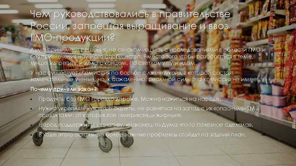 Чем руководствовались в правительстве России, запрещая выращивание и ввоз ГМО-продукции? Дума принимает решения, не ознакомившись с исследованиями в области ГМО и без привлечения научного сообщества. Вместо того чтобы разобраться в теме, лучше запретить, и дело с концом. По светлому пути идём. У нас сущестует «Комиссия по борьбе с лженаукой» , в которой состоят замечательные ученые, но, к сожалению, реальной силы эта комиссия не имеет. Почему приняли закон? § Продукты без ГМО гораздо дороже. Можно нажиться на народе. § Нужно укреплять духовные скрепы, не равняться на запад с их «опасными ГМ продуктами, от которых все американцы жирные» . § Народ поддержит инициативу, «Наконец-то Дума что-то полезное сделала » . § В ходе этого остальные более важные проблемы отойдут на задний план.