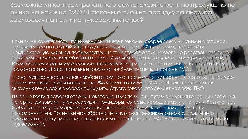 Возможно ли контролировать всю сельскохозяйственную продукцию на рынке на наличие ГМО? Насколько сложна процедура анализа хромосом на наличие чужеродных генов? Если вы не будете знать, что именно вы ищете в геноме, скорее всего никакими экспресстестами у вас ничего найти не получится. Полногеномный же анализ, чтобы найти нехарактерную для вида последовательность, которая есть у некоего не родственного вида это сродни поиску черной кошки в темной комнате. Только комната размером со склад Икеи, со всеми ее пятиметровыми штабелями. В принципе найти можно, но это слишком трудозатратно. И отрицательный результат не будет значить, что это не-ГМО. Что до "чужеродности" генов - любой геном полон различных "чужеродных" вставок. Например геном человека приблизительно на 8% состоит из вирусной ДНК. И некоторые из этих вирусных генов даже удалось приручить. Строго говоря, это делает нас всех ГМО. Плюс не всегда добавляют гены, некоторые ГМО получены путем удаления генов. Или вот была история, как вывели путем селекции помидоры, которые хорошо растут, но почти безвкусные. Собственно в супермаркетах обычно они и продаются. Искали в чем дело, нашли поломанный ген. Починили его обратно, чуть-чуть экспрессию его подкрутили, теперь помидоры и растут хорошо, и вкус вернули, но отныне это ГМО. Но ген-то даже и близко не "чужеродный".