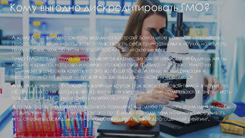 Кому выгодно дискредитировать ГМО? А кому было выгодно сжигать ведьм на кострах? Банальное людское невежество. Просто народные массы хотят почувствовать себя причастными к науке, но изучать тему глубже, чем об этом говорит паблик вконтакте не хотят. Тема ГМО прямо сама напрашивается в качестве такой цели. Ну не будешь же ты ходить и кричать направо и налево, что квантовая физика — это зло. Никто не понимает в широких кругах что это вообще такое. А гены, модификация и непонятное О на конце — тут все как дважды два — «сжечь еретиков!» А еще и какие-то обсуждения в ученых кругах (так всегда с новой темой в науке, но об этом никто не догадывается), значит не уверены, значит сомневаются, значит есть повод, значит ГМО зло и сжечь еретиков опять таки. А государству (не будем показывать пальцем) выгоднее потакать этим идеям, чтобы угодить уже сплоченному вокруг это проблемы народу, чем начинать переучивать его, спорить, а следовательно неизбежно терять свой драгоценный рейтинг.