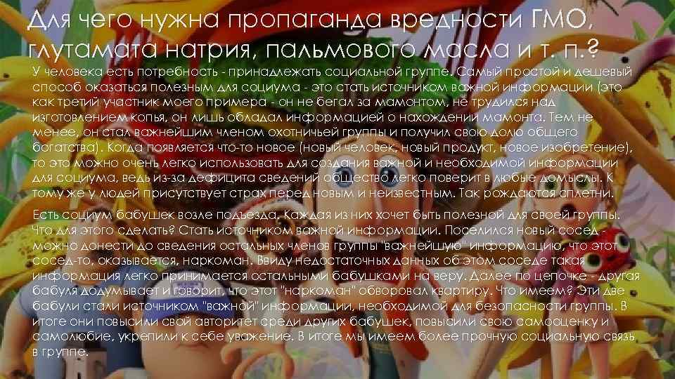 Для чего нужна пропаганда вредности ГМО, глутамата натрия, пальмового масла и т. п. ? У человека есть потребность - принадлежать социальной группе. Самый простой и дешевый способ оказаться полезным для социума - это стать источником важной информации (это как третий участник моего примера - он не бегал за мамонтом, не трудился над изготовлением копья, он лишь обладал информацией о нахождении мамонта. Тем не менее, он стал важнейшим членом охотничьей группы и получил свою долю общего богатства). Когда появляется что-то новое (новый человек, новый продукт, новое изобретение), то это можно очень легко использовать для создания важной и необходимой информации для социума, ведь из-за дефицита сведений общество легко поверит в любые домыслы. К тому же у людей присутствует страх перед новым и неизвестным. Так рождаются сплетни. Есть социум бабушек возле подъезда. Каждая из них хочет быть полезной для своей группы. Что для этого сделать? Стать источником важной информации. Поселился новый сосед можно донести до сведения остальных членов группы "важнейшую" информацию, что этот сосед-то, оказывается, наркоман. Ввиду недостаточных данных об этом соседе такая информация легко принимается остальными бабушками на веру. Далее по цепочке - другая бабуля додумывает и говорит, что этот "наркоман" обворовал квартиру. Что имеем? Эти две бабули стали источником "важной" информации, необходимой для безопасности группы. В итоге они повысили свой авторитет среди других бабушек, повысили свою самооценку и самолюбие, укрепили к себе уважение. В итоге мы имеем более прочную социальную связь в группе.