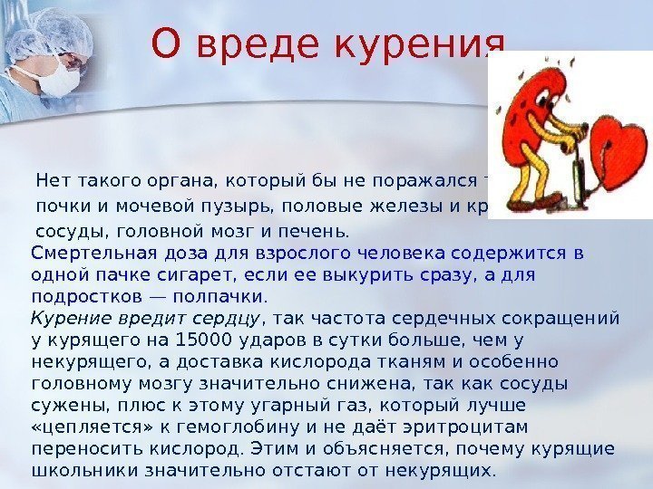 О вреде курения Нет такого органа, который бы не поражался табаком: почки и мочевой пузырь, половые железы и кровеносные сосуды, головной мозг и печень. Смертельная доза для взрослого человека содержится в одной пачке сигарет, если ее выкурить сразу, а для подростков — полпачки. Курение вредит сердцу , так частота сердечных сокращений у курящего на 15000 ударов в сутки больше, чем у некурящего, а доставка кислорода тканям и особенно головному мозгу значительно снижена, так как сосуды сужены, плюс к этому угарный газ, который лучше «цепляется» к гемоглобину и не даёт эритроцитам переносить кислород. Этим и объясняется, почему курящие школьники значительно отстают от некурящих.