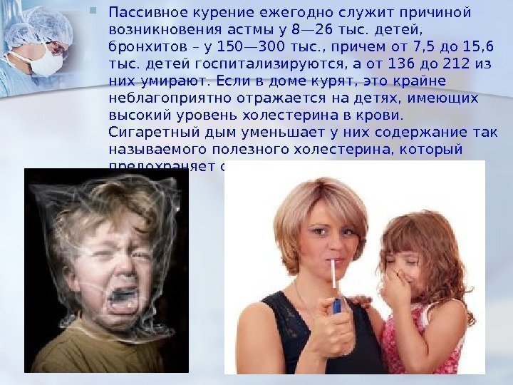 Пассивное курение ежегодно служит причиной возникновения астмы у 8— 26 тыс. детей, бронхитов – у 150— 300 тыс. , причем от 7, 5 до 15, 6 тыс. детей госпитализируются, а от 136 до 212 из них умирают. Если в доме курят, это крайне неблагоприятно отражается на детях, имеющих высокий уровень холестерина в крови. Сигаретный дым уменьшает у них содержание так называемого полезного холестерина, который предохраняет от сердечных болезней.