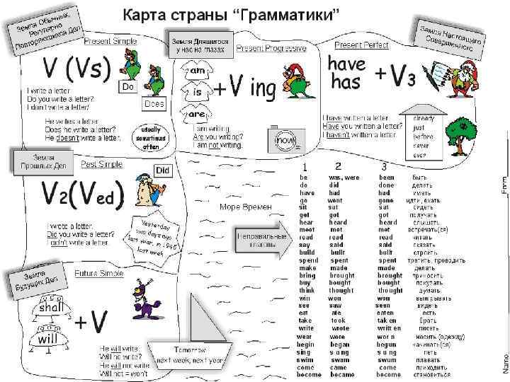 n n n Каждая группа времен в английском языке выражает разные ситуации. Простые времена описывают факт происхождения действия, безотносительно протяженности этого действия. Также они используются для описания действий, которые происходят с некоторой регулярностью. Длительные времена, как следует из названия, описывают то, что происходит в течение какого-либо промежутка времени, как правило, заданного тем моментом, о котором идет речь. Также глаголы данной группы времен всегда строятся с использованием глагола be, и к ним всегда добавляется окончание "-ing". Совершенные времена описывают действия, которые уже завершились к какому-либо моменту времени. Глаголы в данной группе времен всегда используются с вспомогательным глаголом have, и они всегда стоят в форме причастия прошедшего времени. Совершенные длительные времена, как видно из названия, определяют в себе признаки времен совершенной и длительной группы, они описывают действия, которые продолжались на протяжении определенного периода времени. Глаголы данной группы используют два вспомогательных глагола – have и been, и имеют окончание "-ing".