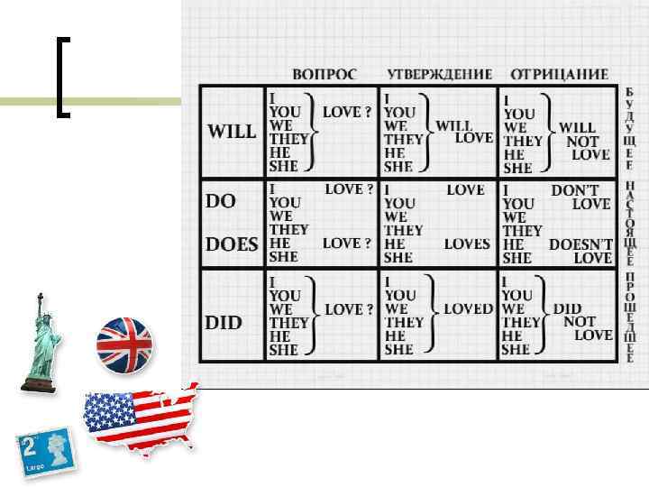 n n n Способ образования Simple Present I форма глагола + окончание -s/-es для третьего лица единственного числа Например: You speak English. Ты говоришь по-английски. Do you speak English? Ты говоришь по-английски? You do not speak English. Ты не говоришь по-английски.