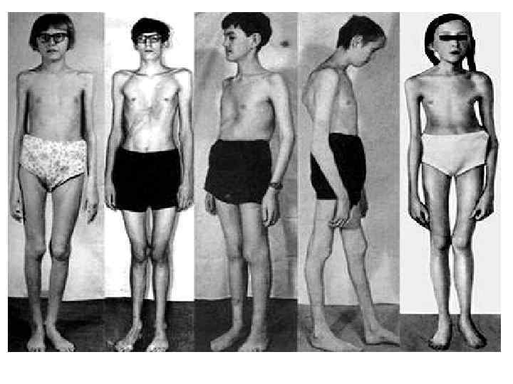 • • Симптомы соединительнотканной дисплазии Внешние (фенотипические) признаки соединительнотканной дисплазии представлены конституциональными особенностями, аномалиями развития костей скелета, кожи и др. Пациенты с дисплазией соединительной ткани имеют астеническую конституцию: – высокий рост, – узкие плечи, – дефицит массы тела. Нарушения развития осевого скелета могут быть представлены: – сколиозом, – кифозом, – воронкообразной или килевидной деформациями грудной клетки, – ювенильным остеохондрозом. Краниоцефальные стигмы соединительнотканной дисплазии нередко включают: – долихоцефалию, – нарушения прикуса, – аномалии зубов, – готическое небо, – несращение верхней губы и нёба. Патология костно-суставной системы характеризуется: – О-образной или Х-образной деформацией конечностей, – синдактилией, – арахнодактилией, – гипермобильностью суставов, – плоскостопием, склонностью к привычным вывихам и подвывихам, – переломам костей.