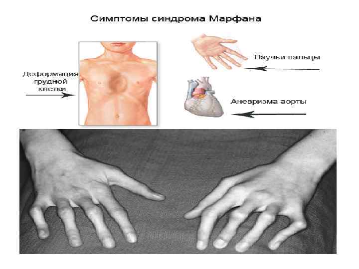 Симптомы синдрома Марфана • • При синдроме Марфана отмечаются нарушение функции суставов (гипермобильность); деформация грудной клетки (воронкообразная или килевидная форма), деформация позвоночника (сколиоз, кифосколиоз, подвывихи и вывихи шейного отдела, спондилолистез), а также плоскостопие и протрузия вертлужной впадины. Сердечно-сосудистая патология, доминирующая в клинической картине синдрома Марфана и часто определяющая его исход, проявляется дефектами структуры стенок сосудов эластического типа, особенно аорты и крупных ветвей легочной артерии, пороками развития клапанного аппарата и перегородок сердца. Изменения аорты у больных синдромом Марфана характеризуются прогрессирующим расширением ее восходящей части и клапанного кольца (дилатацией, аннулоаортальной эктазией) и аневризмами; поражение митрального клапана - миксоматозной дегенерацией створок, патологическим удлинением и разрывом створочных хорд, обызвествлением клапанного кольца. У плода с синдромом Марфана возможно формирование врожденных пороков сердца - коарктации аорты, стеноза легочной артерии, ДМПП и ДМЖП. Органические и функциональные изменения сердца и сосудов у больных синдромом Марфана часто сопровождаются нарушением ритма (наджелудочковой и желудочковой тахикардией, фибрилляцией предсердий) и развитием инфекционного эндокардита