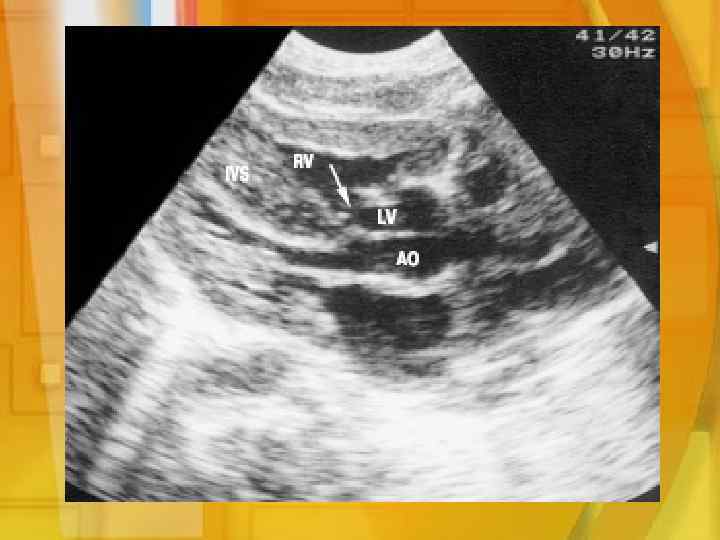 ЭХОКГ 1. полость правого желудочка сужена, либо полностью отсутствует; 2. значительное увеличение толщины межжелудочковой перегородки. Отношение толщины межжелудочковой перегородки к толщине миокарда задней стенки левого желудочка равно или превышает 1, 85 (Митина И. Н. , Бондарев Ю. И. 1981) [9]; 3. отсутствие или сужение устья легочной артерии; 4. наличие сообщений на уровне желудочков, предсердий или боталлова протока.