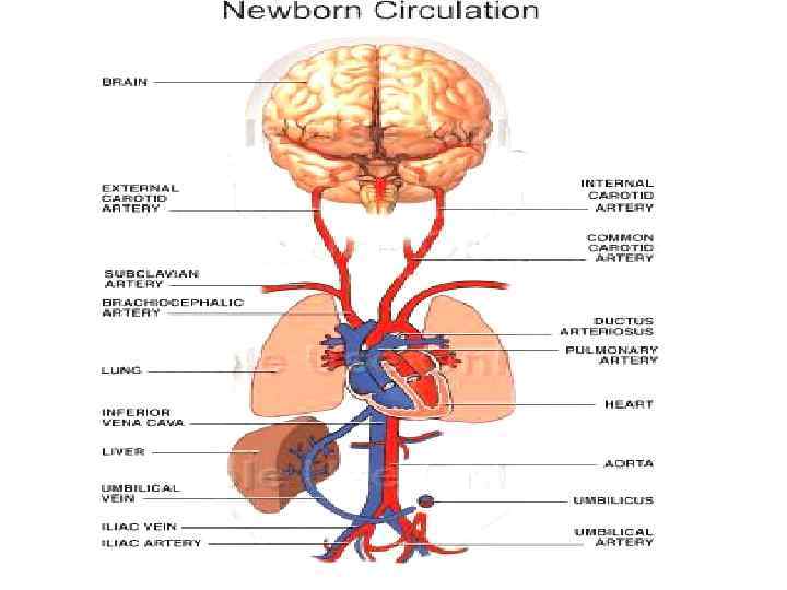 Особенности фетальной гемодинамики (с конца 2 -го месяца) 1. 2. 3. 4. 5. 6. 7. 8. 9. Плацентарная кровь насыщена кислородом на 70%. Плацентарный кровоток делится на два потока: через венозный проток и через печень, преобладающий в левой доле. Функционирование гемодинамически значимых шунтов: через артериальный проток справа налево (60% от сердечного выброса); через овальное окно справа налево. Правый желудочек нагнетает ~2/3 от общего сердечного выброса. Систолическое давление в легочной артерии ~ 80 мм рт. ст. Через легкие проходит 6 -9% сердечного выброса. Попадание крови в ПЖ и ЛА происходит через ВПВ и коронарный синус. Преимущественное кровоснабжение головного мозга и верхних конечностей. Функционируют три круга кровообращения.