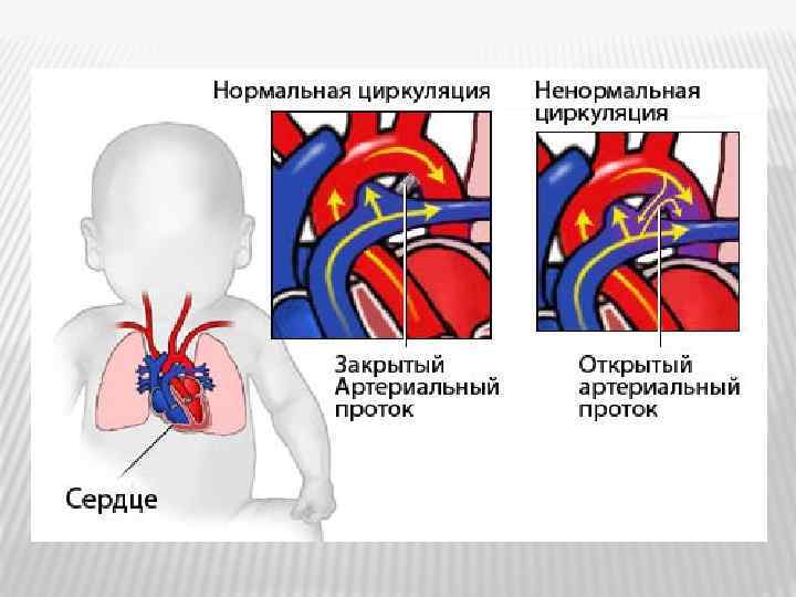 Открытый артериальный проток (ОАП) Открытый Боталлов проток в период внутриутробного развития соединяет ствол легочной артерии с аортой и уравновешивает давление в МКК и БКК. В первые дни после рождения он закрывается. Сохранение его функции после 3 месяцев жизни расценивается как ВПС. В норме закрытие протока происходит в два этапа. В течение 10 -15 часов после родов сжимается мышечный слой его стенки, проток укорачивается. Затем постепенно разрастается соединительная ткань, откладываются тромбоциты, образуется тромб и к третьей неделе жизни проток закрывается.