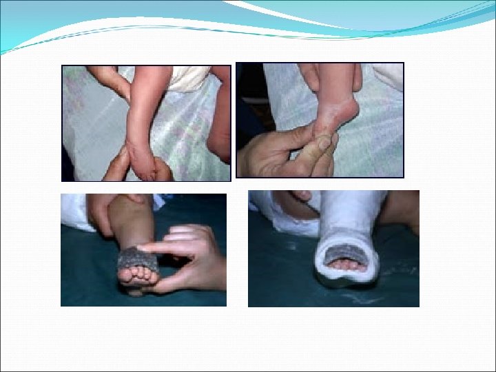 Консервативное лечение косолапости: а – ручная редрессация, коррекция подошвенного сгибания; б) фиксация результатов коррекции с помощью бинтования; в) шина из полиэтилена, применяемая при лечении врожденной косолапости.