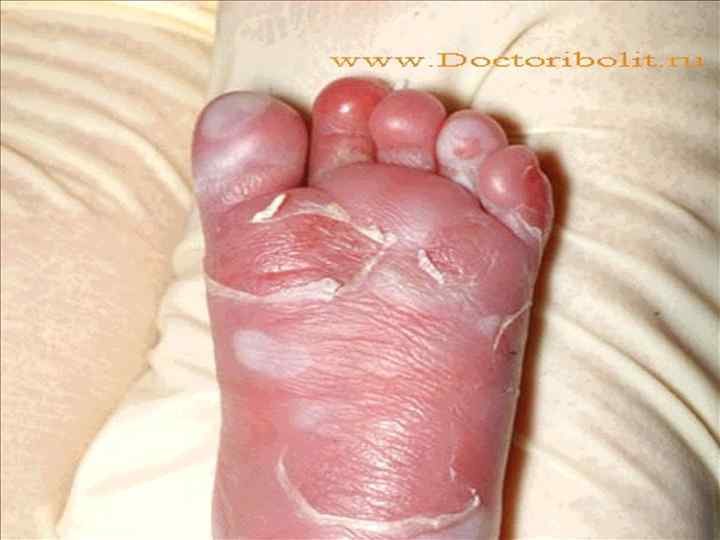 l. В дальнейшем на ладонях и подошвах кожа мацерируется, появляется складчатость ("руки прачки"). l В области лба, волосистой части головы поражение напоминает себорейный дерматит, волосы выпадают и больше не вырастают. l В другой локализации процесс завершается шелушением.