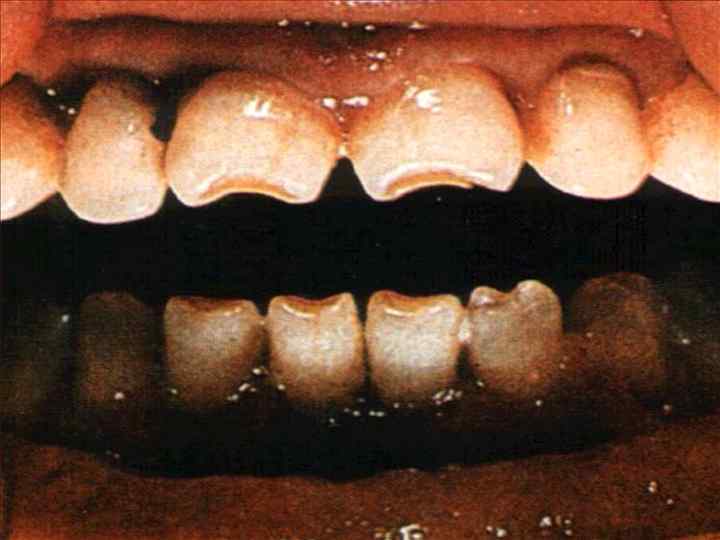 l- зубы Гетчинсона - дистрофия верхних передних резцов. Они имеют бочкообразную форму или форму отвёртки с расширением к десневому краю, заострением к режущему краю и наличием полулунной вырезки.