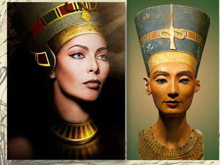Тонкие черты лица с полными губами и огромными миндалевидными глазами, форма которых подчеркивалась специальными контурами, контраст тяжелых причесок с изящной вытянутой фигурой. Чтобы расширить зрачки и придать блеск глазам, египтянки капали в них сок растения «сонная одурь» . Самым красивым цветом глаз считался зеленый. Но это редкий цвет. Предприимчивые египтянки обводили глаза зеленой краской из углекислой меди. Для завершения образа Древние египтянки красили в зеленый ногти на руках и ступни ног.