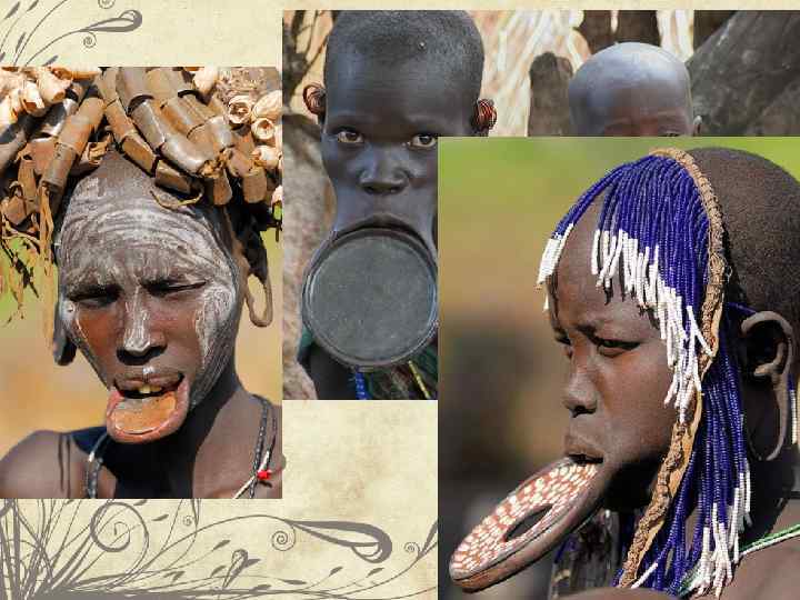 Женщины многих африканских племен вытягивают себе мочки ушей, но на этом деформация мочек не заканчивается. В них они делают дырки, которые могут достигать до нескольких сантиметров в диаметре. Их они заполняют разними палочками, проволочками, бусами.