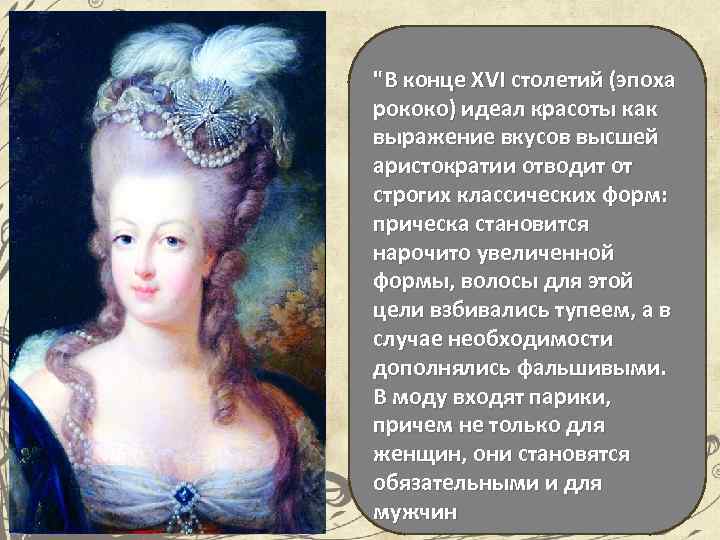 "В конце XVI столетий (эпоха рококо) идеал красоты как выражение вкусов высшей аристократии отводит от строгих классических форм: прическа становится нарочито увеличенной формы, волосы для этой цели взбивались тупеем, а в случае необходимости дополнялись фальшивыми. В моду входят парики, причем не только для женщин, они становятся обязательными и для мужчин