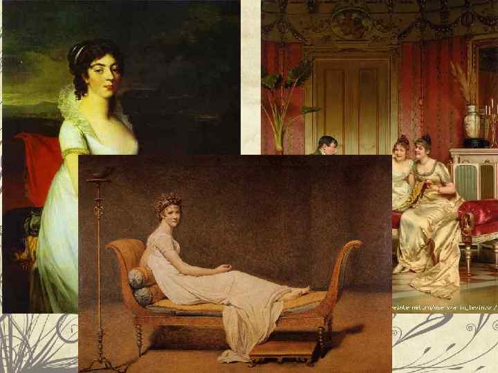 Как понимали красоту в эпоху классицизма (кон. 18 в. ) В моду снова входит естественные очертания фигуры и простота форм. В то время подражали античности и всему тому, что считалось античным. В моде стройная юная фигура с плавными линиями, как подобие античной статуи. Силуэт женской фигуры вписывался в вытянутый прямоугольник со сторонами, примерно равными ширине плеч, талии, бедер и низа юбки. При этом происходит полный отказ от использования корсетов.