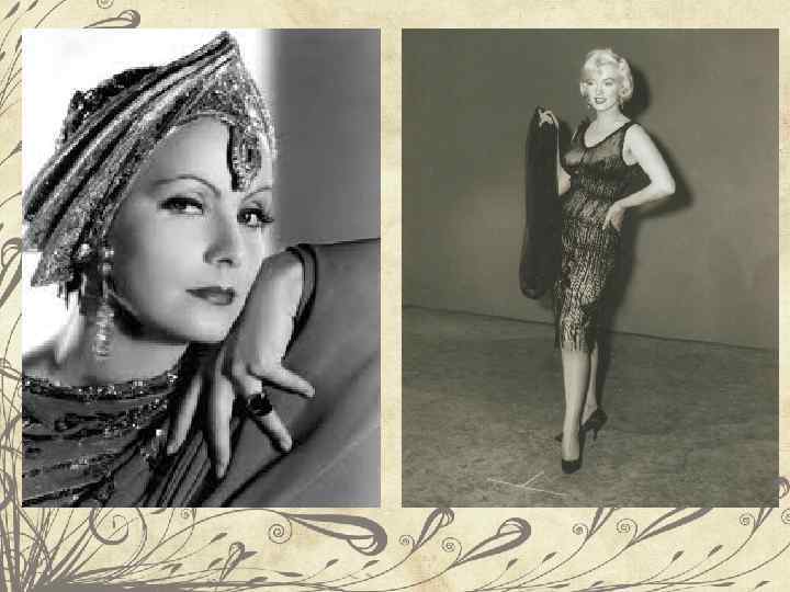 Как понимали красоту в 1920 -е гг. Типаж: худоба, угловатость, плоская грудь. Лицо: маленький рот-сердечко, влажные глаза (веки мазались вазелином), выщипанные брови дугой. Макияж роковой: бледность, черные тени, подводка, красная или вишневая помада. Прическа: прилизанные короткие волосы или спущенные на лицо волны. Одежда: прямой крой, заниженная талия, вызывающий вырез на спине. В 1926 году произошла мини-революция: появилось знаменитое черное платье Габриэль Шанель. Аксессуары модниц: меха, шляпы, шарфы, перчатки, чулки, нитка жемчуга, духи «Шанель № 5» .