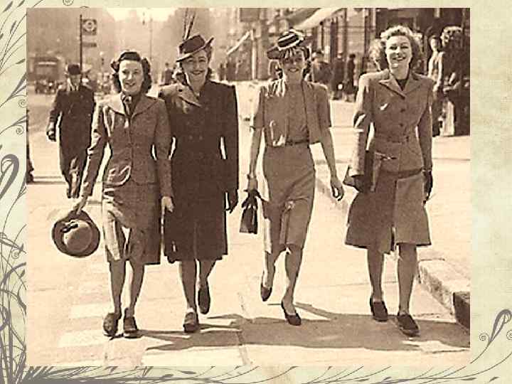 Героиня 40 -х - это строгая, но очень элегантная дама. Экономия и только экономия: укороченные юбки, противогазные сумки на длинном ремне, пробковые танкетки - что поделаешь, кожа и ткань нужны армии. Основу ее гардероба составляют форменные платья и костюмы. Входят в моду юбки. Самый распространенный женский костюм: жакет приталенный, с жесткими небольшими «подплечниками» и прямой юбкой до колена. В деталях фасонов встречаются военные элементы: кокетки, карманы, манжеты, хлястики, широкие пояса с пряжками, воротники как на мужских сорочках. 1940 -е годы