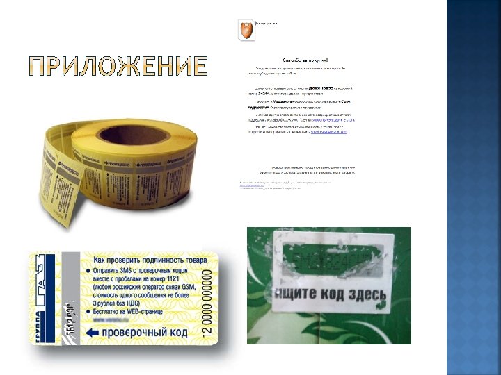 ЭЛЕКТРОННАЯ ПОДПИСЬ Суть идеи заключается в том, чтобы для каждой единицы продукции была своя, своего рода электронная подпись. Причем делать это не через Интернет, а используя СМС. Вы идете в магазин покупаете продукт, убедившись, что упаковка не нарушена. В упаковке или на упаковке с скрэч полем есть некий код, он состоит из порядкового номера продукта и контрольного числа. Затем СМС-кой отправляете код с контрольным числом, в ответ вам приходит один из ответов: Такой-то продукт подлинный, срок годности такой-то(если предусмотрен). Спасибо за участие в программе hp. vsegdauveren. com. Такого кода не существует либо код не совпадает с контрольным числом. Вероятно товар подделка. Обратитесь в службу поддержки hp. vsegdauveren. com. Такой код уже зарегистрирован «дата» . Обратитесь в службу поддержки hp. vsegdauveren. com. Это СМС для абонентов будет стоить в соответствии с тарифом короткого номера 1121(примерно 3, 60 коп. с НДС). www. vsegdauveren. com