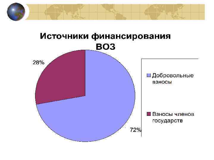 Бюджет ВОЗ Общая сумма расходов 3, 3 млрд. дол. 53% - основные мероприятия по медикосанитарному вмешательству 21% - поддержка государств членов ВОЗ 13% - программы здравоохранения и медицинские товары 11% - детерминанты здоровья