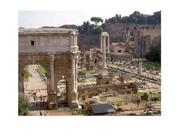 Эпоха поздней Римской империи, династия Северов III - IV вв. • Руины терм и триумфальные арки • Термы Каракаллы (территория 340 х 330 м. Высота 30 м. ) • Комплекс терм включал большой зал с бассейном, роскошно декорированный главный зал с холодной, теплой и горячей банями, под полом которого находилась сложная система водоснабжения, отопления и канализации. По фасаду главного здания располагались комнаты для отдыха. Также были размещены две палестры, библиотечные залы и залы для занятий музыкой, раздевальни. Термы Каракаллы могли вмещали одновременно более 2000 человек. • Арка Септимия Севера (20 м. высотой) в честь и его побед над варварами.