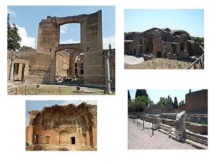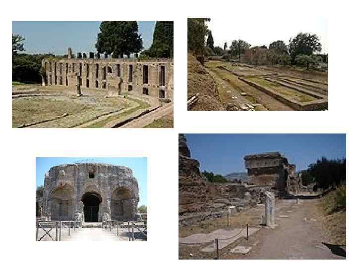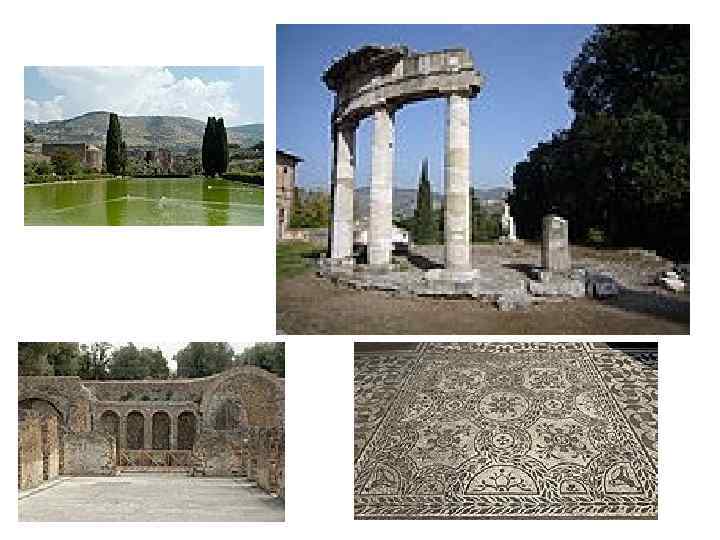 • Тиволи – небольшой город в 24 км юго-восточнее Рима • Вилла была построена между 118 – 134 гг. • Площадь – 300 га • В состав виллы входило около тридцати зданий, разбросанных по площади в один квадратный километр. • Сегодня сохранилась1/5 часть построек • Известно, что император дал им названия в честь тех городов империи, в которых он побывал. • Отсюда происходят некоторые из наиболее знаменитых античных статуй: Дискобол, Диана Версальская, Антиной Капитолийский и т. д. • Немало мраморных колонн было вывезено с виллы по приказу Ипполито д´Эсте для строительства его собственной виллы в Тиволи