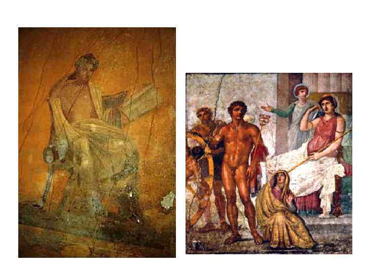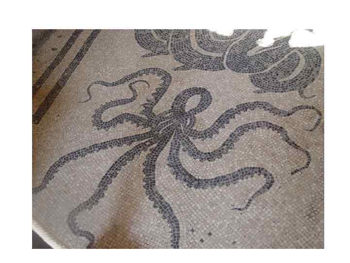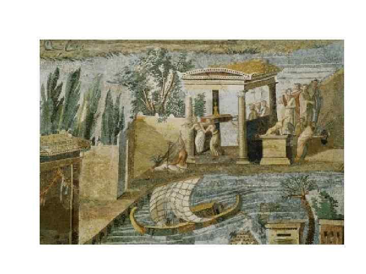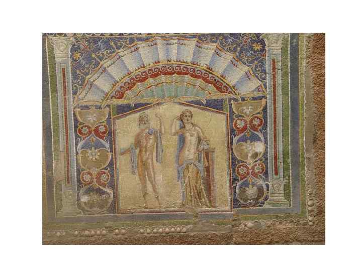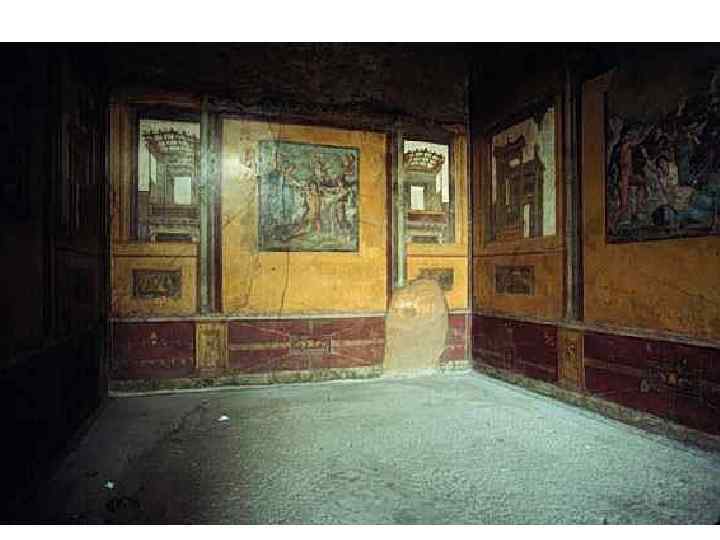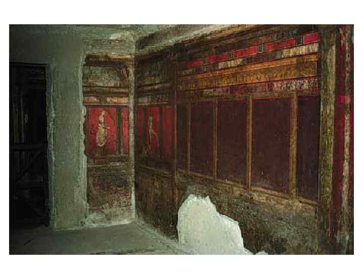 Геркуланум • Правильная планировка • Город поделен прямыми улицами на восемь кварталов. • В городе были театр, термы, палестра. • Основной тип жилища – вилла (более богатое убранство), украшенные настенными росписями и напольными мозаиками.