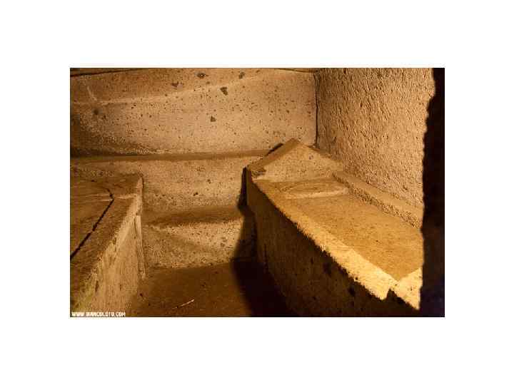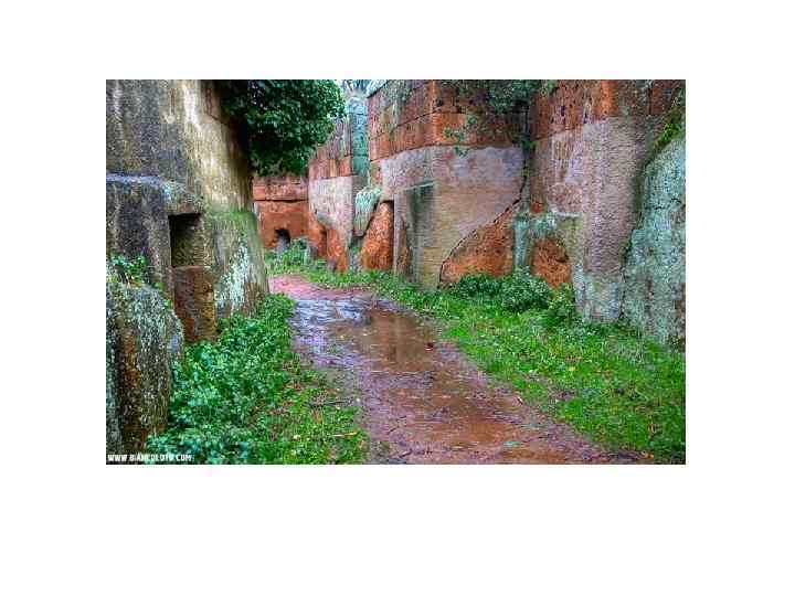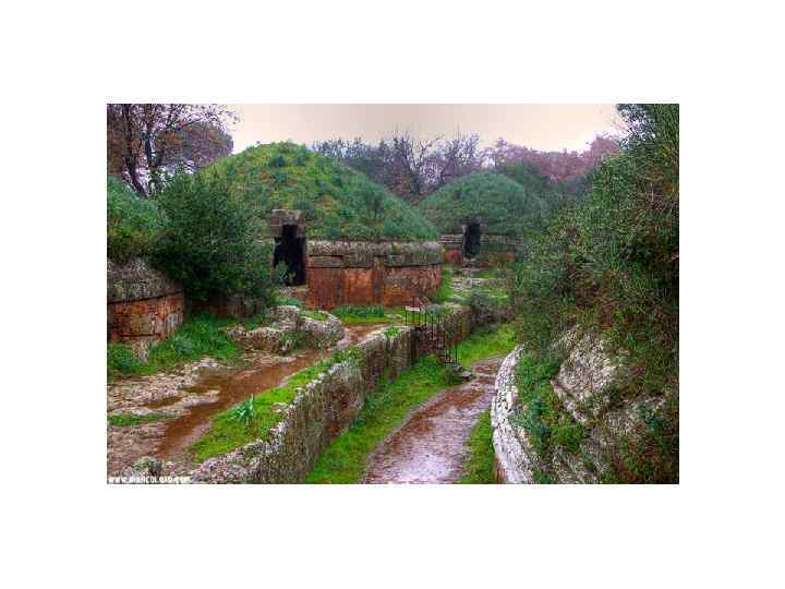 Гробницы. Типы гробниц: • курганы с расположенными под насыпным холмом погребальными камерами и дромосом, сложенными из каменных блоков (тумулус), • разновидность тумулуса, но сложенные не из отдельных камней, а целиком высеченные в туфовых скалах (гробница Реголини Галасси, гробница Нарисованных львов, Гробница Леопардов - 7 в. до н. э. ), • подобие прямоугольных домиков, в совокупности образующих своеобразный город мертвых, • гробницы многокамерные, укрытые под большим курганом, иногда обнесенным стеной.